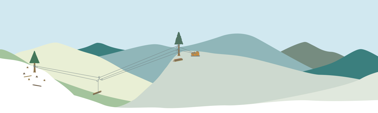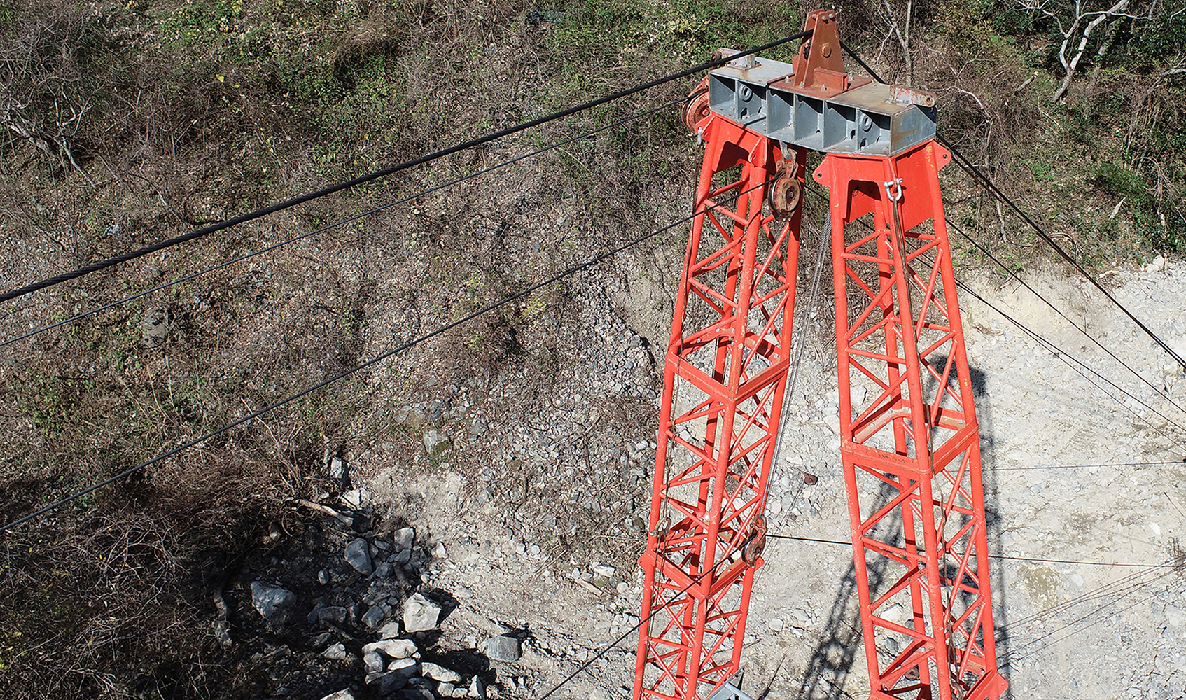 山の地形を活かして架線を張り、空中に吊り下げ、集材機で巻き上げながら集積場まで運びます。急峻で林道や作業道がない場所や、地形が複雑で林業用重機が入っていけない現場でも搬出できる架線技術が弊社の強みです。